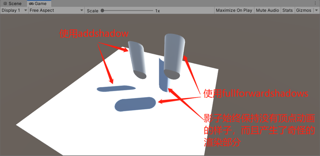A3:根据羽飞同学的回答,做了一个对比实验,渲染的模型是Unity自带的Cylinder,在Surface Shader中加了顶点动画,效果如下图: