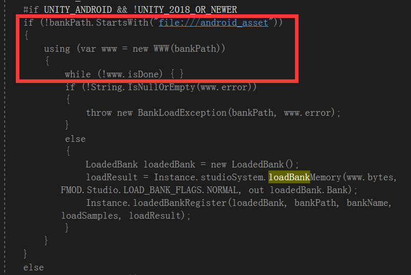 Q:我们在Unity 2017.4.22f1版本中集成了FMOD,在最近的性能测试中发现它的内存占用比较大,然后发现是FMOD在LoadBank时分配了大量内存。在源码中发现,如果FMOD的LoadBank函数在安卓平台上的路径为非file:///android_asset开头的bank文件,会采取WWW阻塞式加载,也就意味着,如果bank文件不是放在StreamingAssets目录下,bank文件就不可能采取FMOD的流加载方式。这看上去是一个非常低端的做法,不知道大家有没有使用过FMOD?能否提供什么解决方案呢?FMOD的版本是2.00.03。