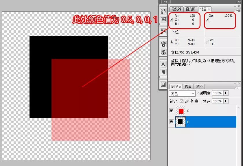 假如有两个颜色,S=1,0,0,0.5,D=0,0,0,1。按照PS里的透明度算法Oa=1-(1-Sa)(1-Da)来算,最终颜色O的Alpha值为1-(1-0.5)(1-1)=1,如图1。