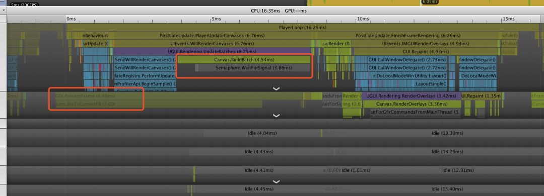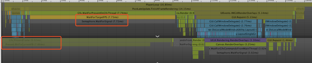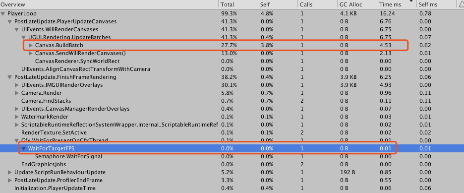 而在BuildBatch耗时低的其它帧,这里等待的时间被统计在WaitForTargetFPS中。