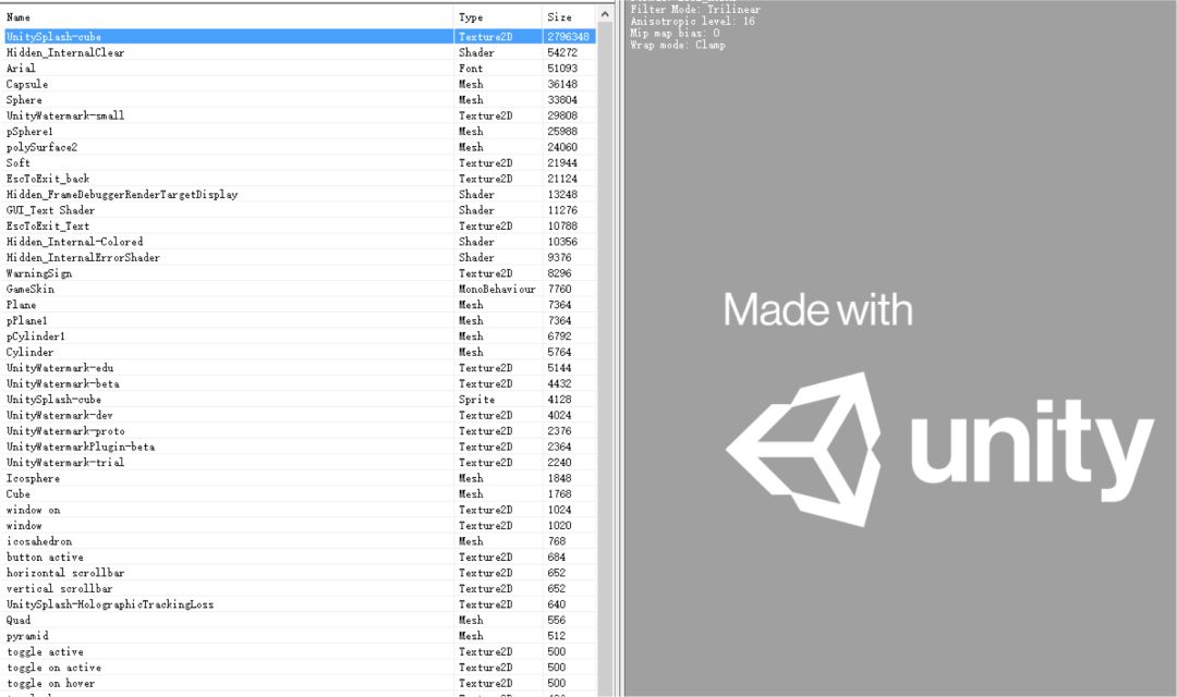 Q:用AssetStudio解包自己游戏打出来的包,发现包里有UnitySplash-cube这张图片,Unity版本是2017.4.10,也找不到哪里用了,求问怎么能去掉它?