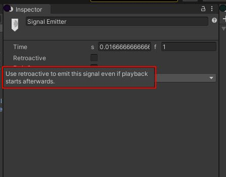 The Retroactive property, when enabled, will trigger the signal if the timeline begins playing after the signal’s time.