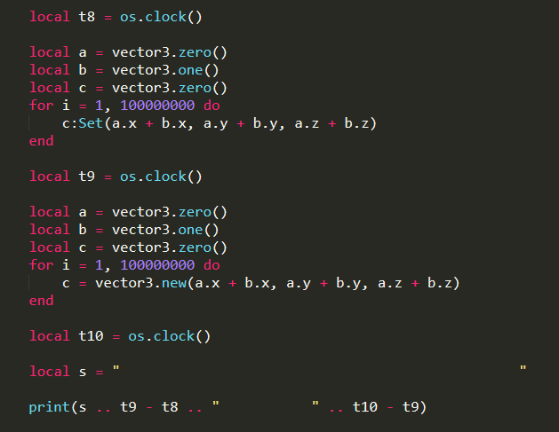 你的案例比较的是通过Metatable调用函数以及直接调用函数看谁更快。因为主流的Lua面向对象实现,使用obj:XXX()方式调用函数,都是通过Metatable去完成的,这种做法虽然很适合支持继承,但是多了一次Metatable的查找,性能肯定是会变差的。把Vector.Set缓存一下,就节省了这些查找时间。