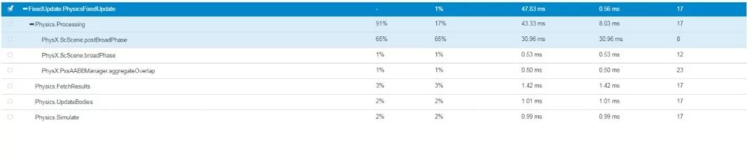 而题主中的物理模块之所以会调用次数这么高,其主要原因是其他模块的耗时很卡,所以导致了物理模块的FixedUpdate在一帧中不断更新,而17次是默认情况下的上限值。物理模块有个有意思的特点,就是你的项目越卡,它会让你的项目更卡,切记!