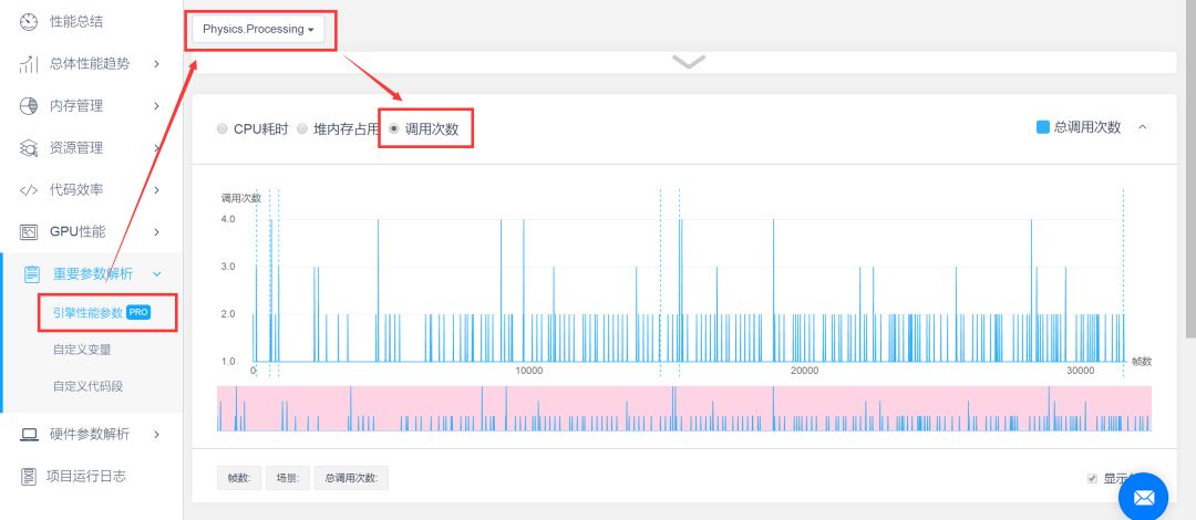 A:首先,这是Unity引擎中物理模块的主要耗时开销。从图中可以看出,你们物理模块较高的一个主要原因是调用次数过高,显示了一帧中调用了17次,就算一次开销1ms,调用17次,也有17ms。所以,调用次数是需要题主项目中最需要注意的一点。游戏运行过程中物理模块的调用次数可以通过下图中的箭头查看,同时,物理的调用次数最好是每帧控制在1~3次,如下图所示。