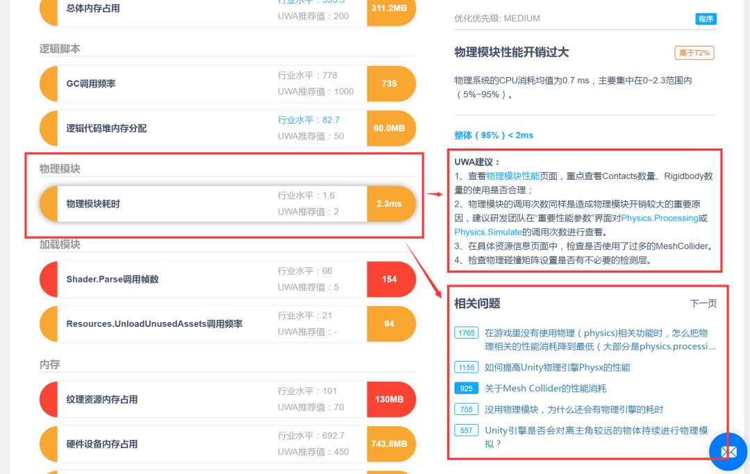 Q:我们游戏项目使用UWA深度评测报告FixedUpdate.PhysicsFixedUpdate存在较大的CPU耗时,想问下这一块的耗时是怎么导致的,该如何优化?