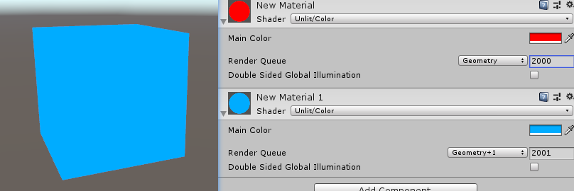 所以,如果你想控制两个材质球的渲染顺序,就调整材质球的RenderQueue就好了,谁大谁就在后面。