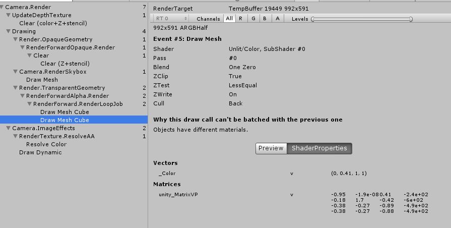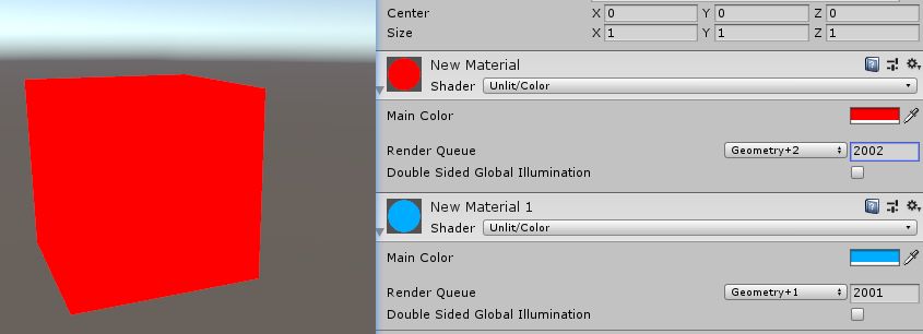 关于顺序,RenderQueue相同的情况下,不透明和透明的排列顺序不同(不透明由近到远,因此可能认为数组顺序应该反着来做,透明的由远及近,按照数组顺序来),对于多材质的Mesh的材质渲染顺序似乎也不同。(注意,这里虽然RenderQueue设置到了半透明队列里,依然开启了ZTest和ZWrite)