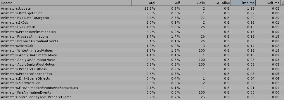 另外,还要看100根骨骼是最大化骨骼,还是所有角色参与蒙皮的骨骼数量都是100根,这里可能也会有性能差异。我也做过一个简单的测试,最终影响Animator.Update性能消耗的是参与蒙皮的骨骼数量,这样如果采用最大化骨骼方案的话,其实不用特别限定最大化骨骼的数量,而是应该限定每个角色参与蒙皮的骨骼数量。
