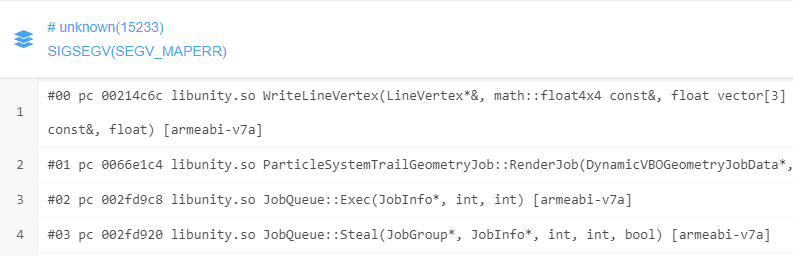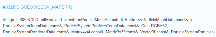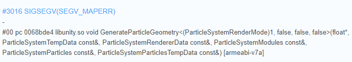 11月30号中午正式开测,到下午4-5点后,部分同事反馈告诉我说,崩溃率有点高,平时测试都不会闪退,今天闪退2-3次了…其中一个同事告诉我说,挂机15分钟内必崩溃…当时听到这个问题后心里一紧,赶紧去看了下bugly,发现崩溃率到了7.x%,远高于平时我们测试2.x%的统计,我再仔细一看,都集中在各种粒子系统崩溃中: