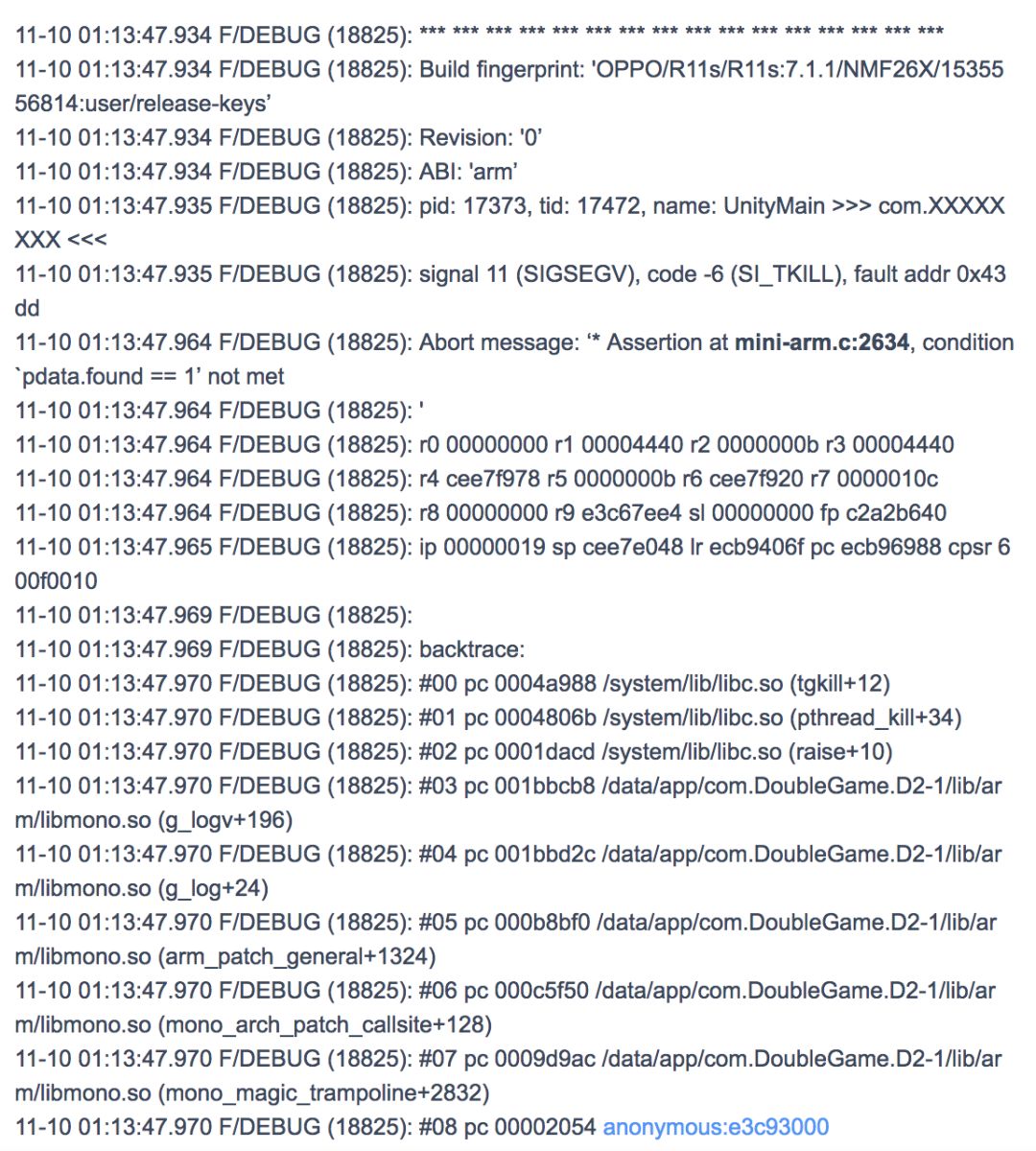 之前,崩溃在libmono.so “Abort message: Assertion at mini-arm.c:2634, condition `pdata.found == 1’ not met” 的这个低概率随机崩溃问题一直困扰着我,主要是这个问题崩溃在mono,崩溃的栈信息完全与libunity.so,libmain.so无关,更别说基于Unity的逻辑层代码,面对我们的对外测试11月30号时间临近,我在28号的时候对mono进行一次简单的处理:将mono代码mini-arm.c:2634 中的断言 g_assert (pdata.found == 1); 注释掉,换成了普通的错误信息输出,编译后直接提交到项目工程中,毕竟这个改动算是无害处理,然后开始去优化项目中卡顿点去了,也没有继续跟踪这个改动,因为当时想到是小概率事件。