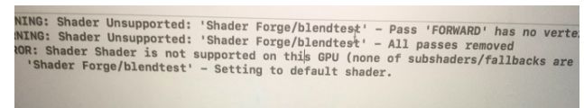 A2:首先切换到iOS平台,选择出错的Shader,有可能会显示Shader is not supported on this GPU,点击Compile and Show Code,应该会显示“Compile errors generating this shader.”如果是这样的话,说明你用了Graphics API不支持的Feature。