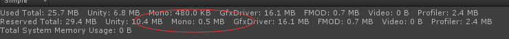 Profiler的Used Mono约500KBUnity 官方的Memory Profiler约50KB我们用UWA GOT的Direct 模式测了下也是约50KB