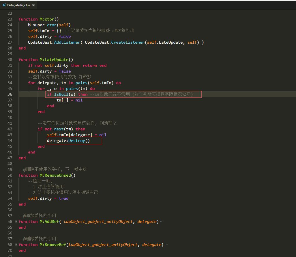 1)Lua DelegateMgr中记录委托被哪些C#对象引用了,并定时清理无用的委托。