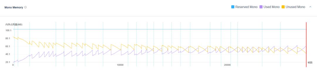 UWA:无论是测试一还是测试二,从一开始就Reserverd Mono较高(蓝色线条)且Unused Mono(黄色线条)同样较高,这个是典型的游戏启动时大量堆内存分配且马上被GC掉所致。一般来说,这种情况常见于文件解压、配置文件加载所致。题主可以查看在游戏启动时是否确实存在如此操作。