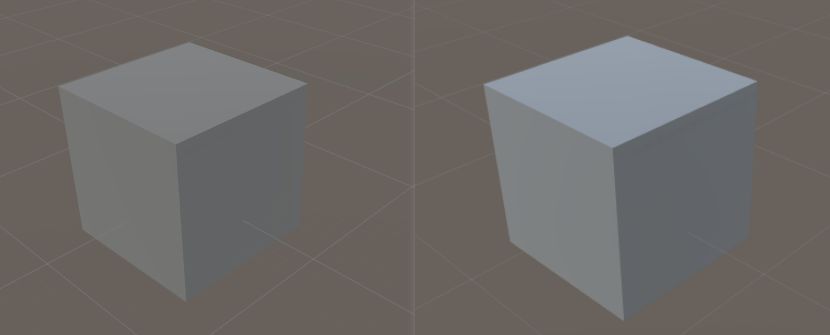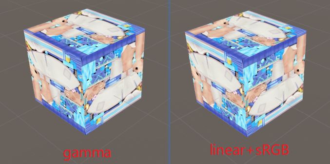 做一个简单实验,在没有贴图的情况下,光照强度为1,Cube的颜色为(128, 128, 128),在线性空间下和Gamma空间下的渲染效果:(Unity 5.6版本,Standard材质)