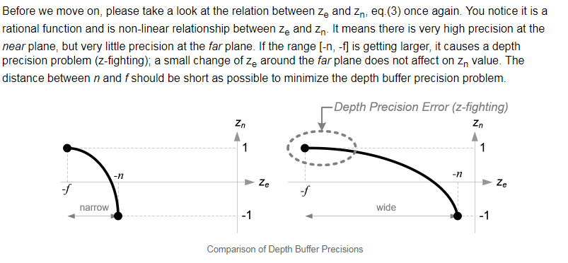 在NDC空间中,离近切面近的点,Z的精度会比较高,离远切面近的点,Z的精度会很低。如果远切面的值过大,那么就会容易出现Z-Fighting。基于透视原理,基本上这个问题是无解的。只能考虑曲线救国的方法绕过这个问题。