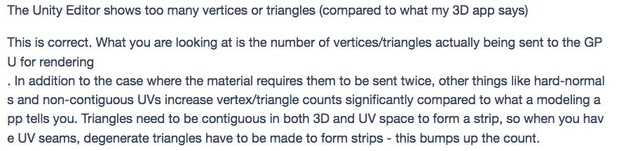 Q:同一个模型,在Unity中显示的顶点数与面片数远多于在3ds MAX中显示的顶点/面片数。大家知道这是为什么吗?