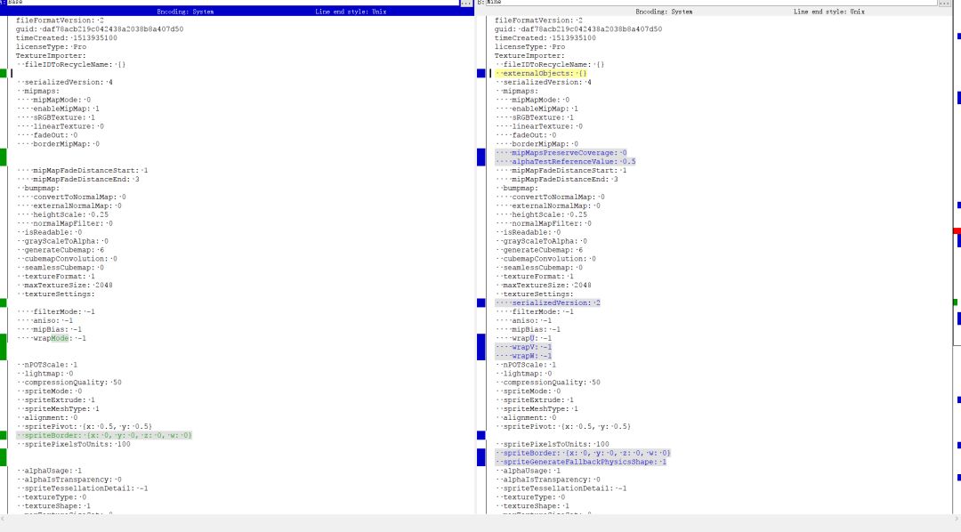 Q:我们项目从Unity 5.6升级到2017.4.3之后,美术的贴图文件都发生了改变,主要是Meta自动被修改了,修改如下。这个是不是Unity版本自身的问题,导致贴图的一些信息被改变了?
