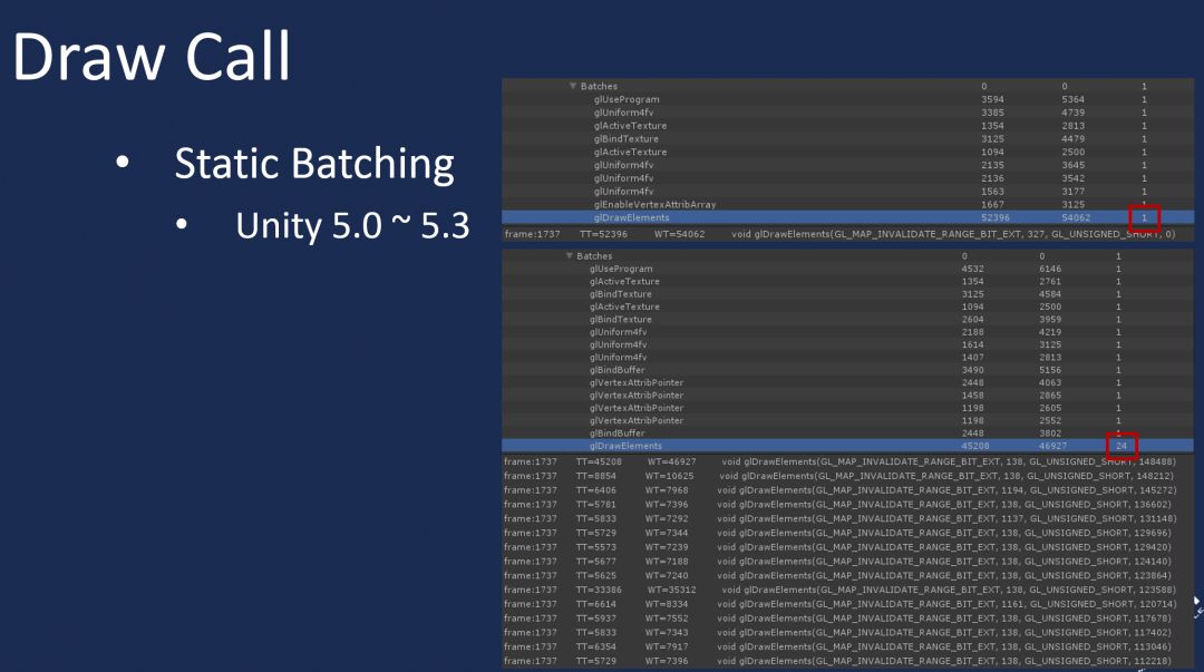 UWA:这个截图中的问题有点老了。从现在往回看,准确地说,是Unity 5.0~5.3版本中,Static Batching是不影响Graphics Driver中的Draw Call次数的,这是因为在这些版本中,Unity并不会去像4.x中那样会动态合批index buffer。这点我们在今年的UWA Day上有过详细解释。