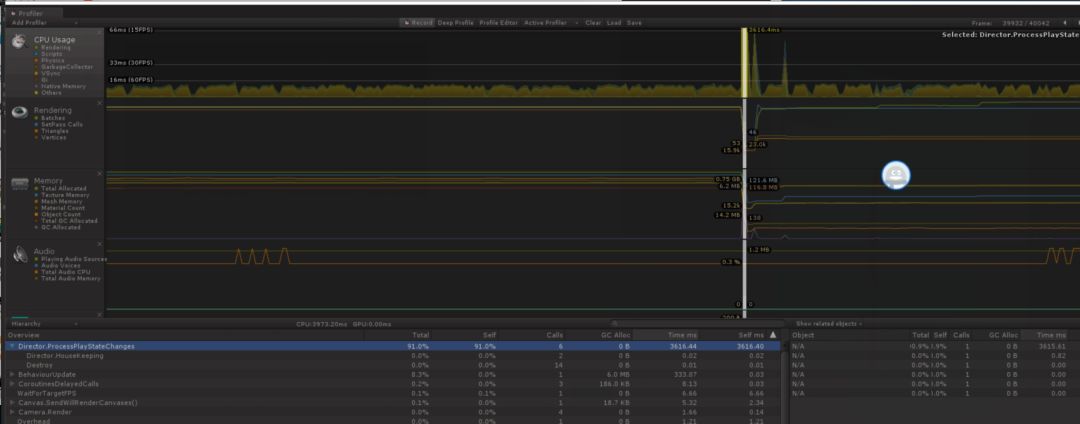 Q:游戏在运行一段时间后,出现了一个CPU高占用函数:Director.ProcessPlaySateChanges ,它产生了3616ms的耗时,请问这是怎么产生的,确认C#代码中无此方法调用,有人遇到过这个问题吗?(版本Unity 5.6.5p3)