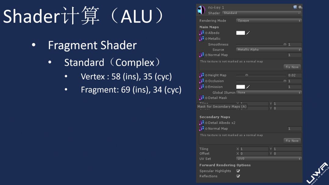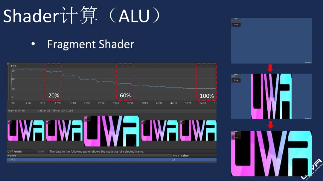 UWA:估计是ALU的问题使得GPU压力过大,其根本原因还是模型上Fragment Shader的指令集过高,从而导致渲染的Pixel数量越大,其GPU开销就越高,类似于我们在UWA Day 2018上关于Standard Shader的屏占实验。在低端设备上,屏占超过20%,其GPU耗时就已经超过20ms。