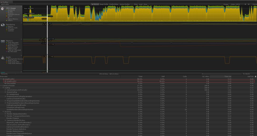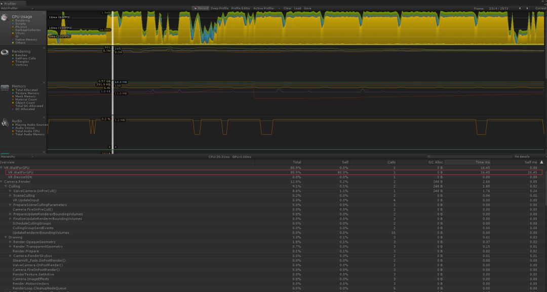 图示为近处观察模型时,帧率下降严重,VR.WaitForGPU占比很高。想请教大神,为什么近距离观察会导致VR.WaitForGPU这一项升高呢?