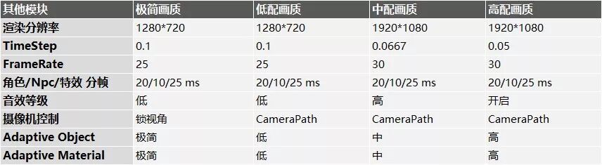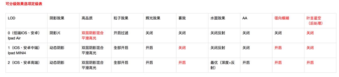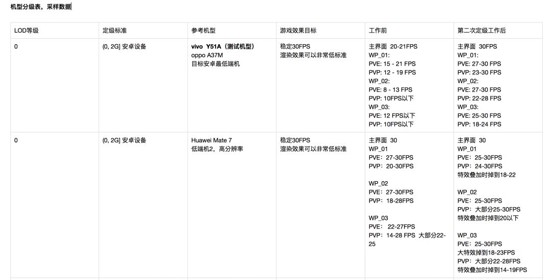 王亮:我们的项目还在开发中,也经历了同样的过程,最后也形成了类似的文档。这个过程中我的体会是,虽然感觉最后形成的是一个表,会根据这个表提供机型的预设配置。但是实际上针对自己的项目,高中低主力机型,FPS的目标,渲染效果的要求不同,结果可能会大不一样。