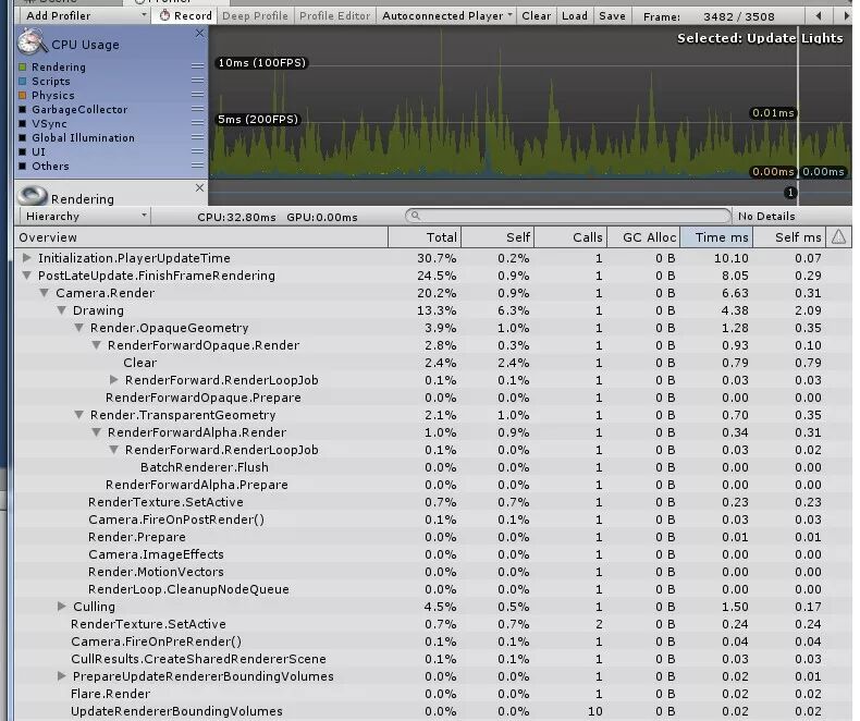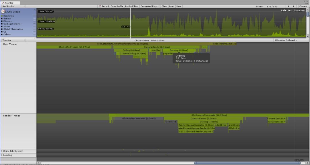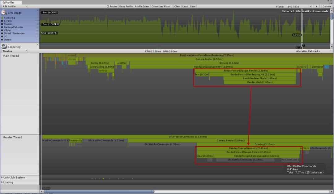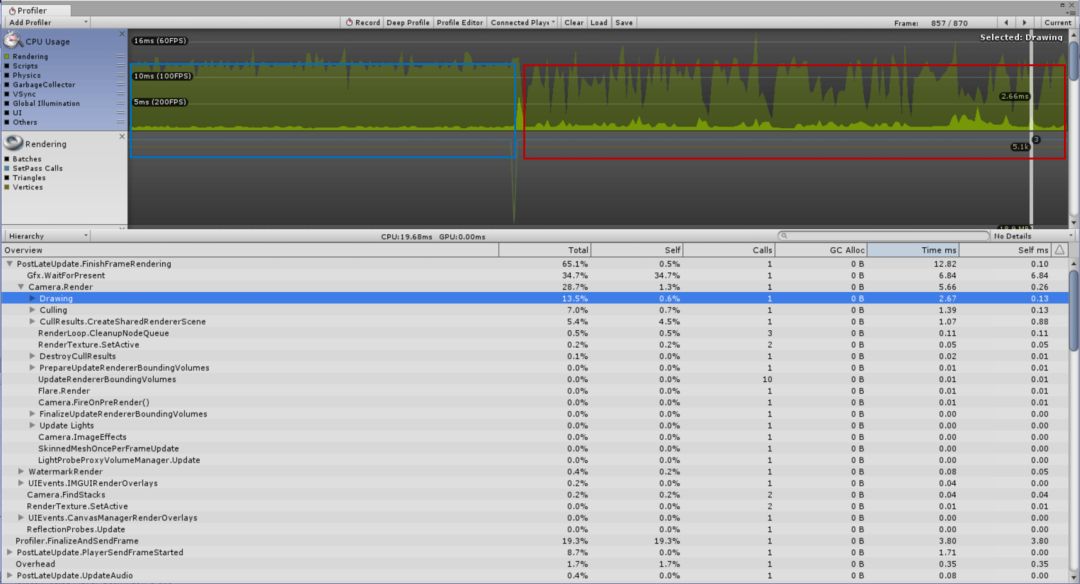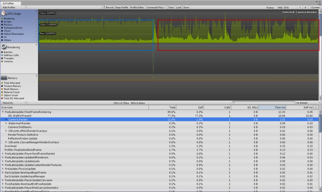 由上图可知,小米4的Camera.Render耗时不稳定,有时候会出现10+ms的峰值。通过查看Unity Profiler以及和其他设备进行对比,发现了以下两点是造成小米4上耗时不稳的原因: