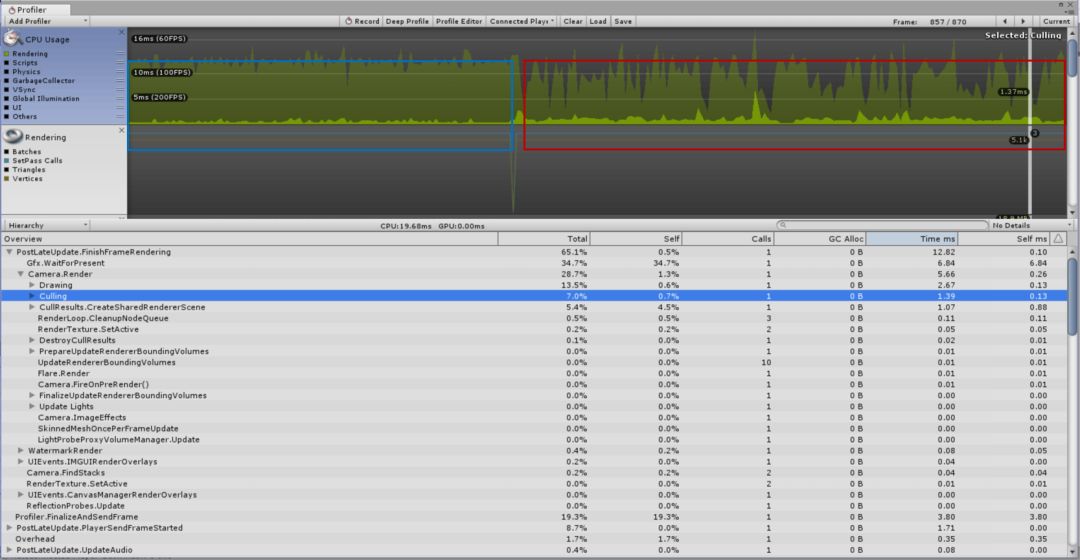 1、Culling不稳下图为小米4和华为6Plus设备上,Culling操作的耗时比较。蓝框为华为6Plus设备,红框为小米4设备。通过Timeline可以看到是场景SceneNode的计算导致。