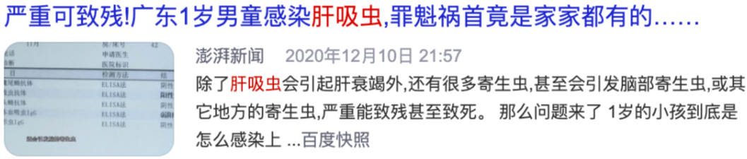 12月10日,《澎湃新闻》报道了广东一名1岁男童感染多种寄生虫的新闻。