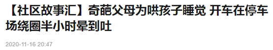 结果怎么绕孩子都不睡,终于把孩子绕睡了,家长赶紧停车下去呕吐!原来停车场太小,转圈把家长转晕了!