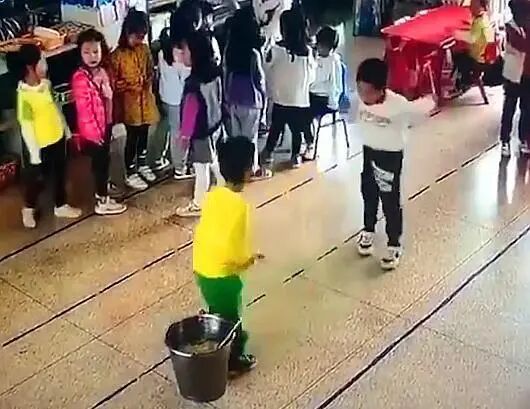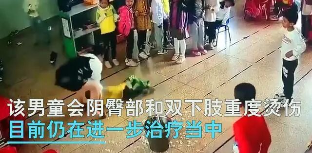 期间,两个男孩在过道内打闹,其中一名5岁的男孩后退着没看到背后的汤桶,一屁股坐在了汤桶里……