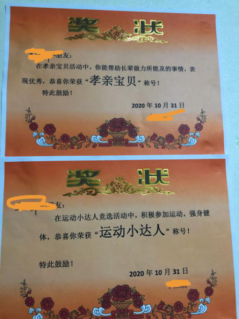 从那以后,儿子每天从学校回来都开开心心的,在10月底还得了三个奖状。看到儿子进步,做母亲的别提多高兴了。