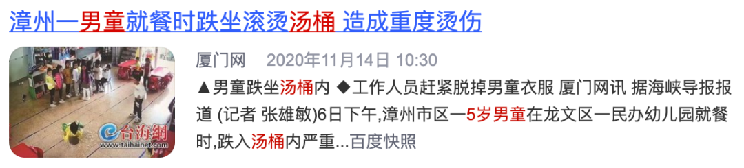 漳州市区一5岁男童在龙文区一民办幼儿园就餐时,跌入汤桶内严重烫伤。