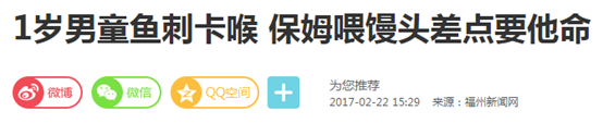 2017年,福州一个一岁男童鱼刺卡喉,保姆发现后马上给孩子喂馒头,想着吃口馒头“顺”下去。
