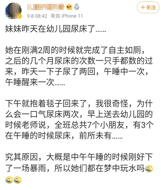 网上有位家长发文称女儿2岁时就能自主如厕,之后尿床的次数一只手都数的过来,结果这次在幼儿园一天尿了两回,午睡中一次,午睡醒来一次。
