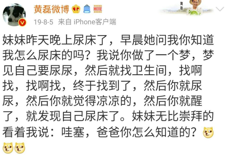 记得曾经黄磊分享过一条关于女儿尿床的微博,那个时候小女儿已经5岁了,却出现了尿床。