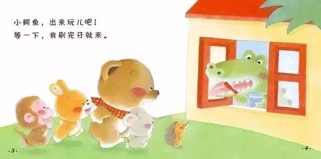 比如《小熊宝宝——刷牙》,讲的是小动物们去找小鳄鱼玩,发现小鳄鱼在刷牙,于是大家纷纷回家刷牙去。