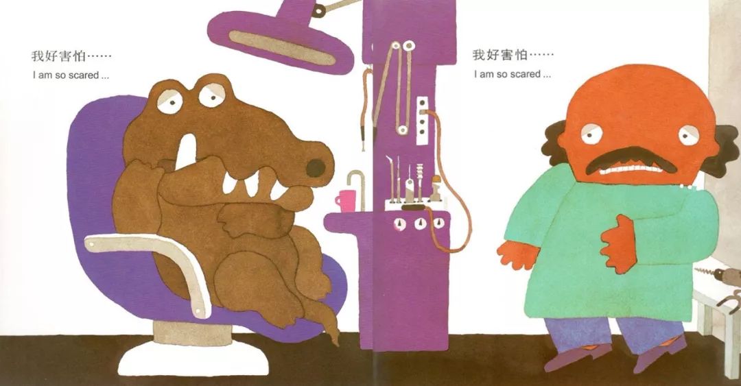 比如《鳄鱼怕怕牙医怕怕》里面,小鳄鱼因为牙疼去看牙医,它非常害怕牙医,而牙医也非常害怕它,场面非常有趣,既能缓解孩子对牙医的抵触感,又能让孩子知道只有认真刷牙才不容易牙疼。