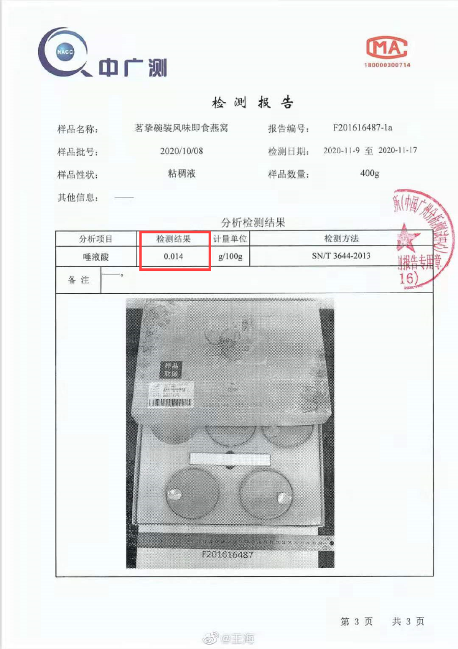 王海则回复“当燕窝忽悠粉丝的茗挚糖水唾液酸含量高达万分之一点四,价值高达人民币0.07元!目测成本每碗连带包材、内容物、加工费,工业成本不超过1块钱!”