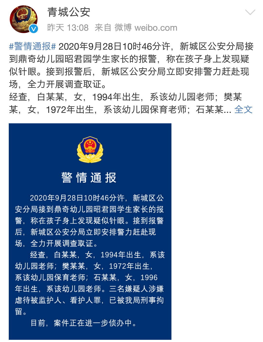 2020年9月28日10时46分许,新城区公安分局接到鼎奇幼儿园昭君园学生家长的报警,称在孩子身上发现疑似针眼。
