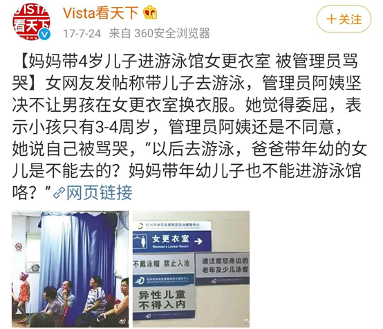 类似的事情也并不是第一次发生,另一件闹得沸沸扬扬的新闻就是2017年妈妈带4岁儿子进女更衣室被骂哭。