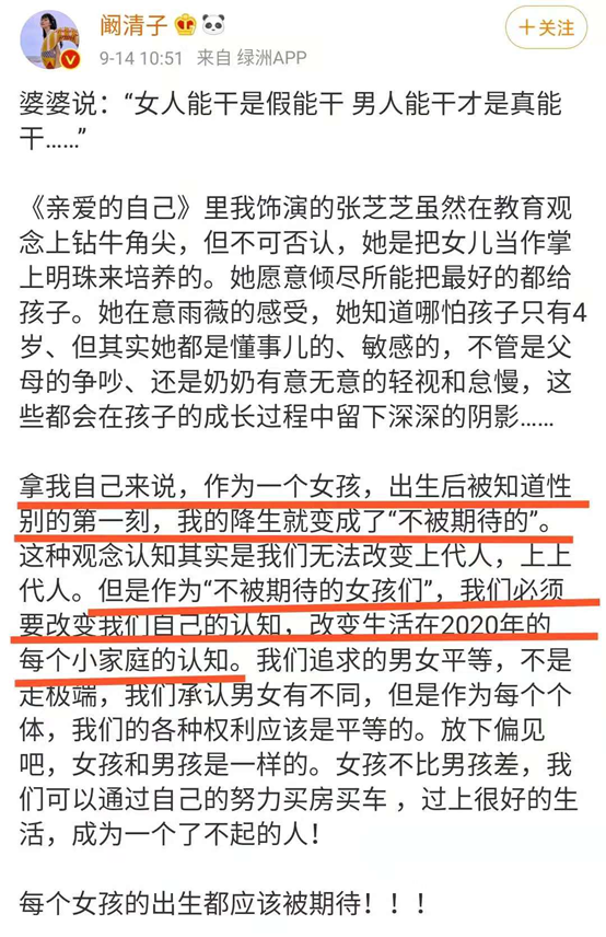就像阚清子所说:“作为一个女孩,我的降生不被期待。但作为不被期待的女孩们,我们必须要改变我们自己的认知,改变生活在2020年的每个小家庭的认知。”