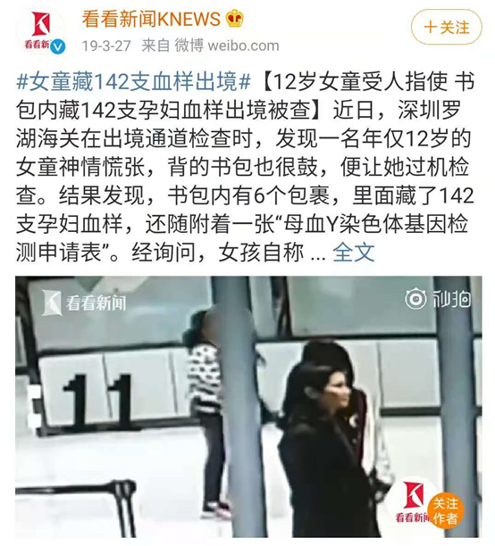 比如2019年,深圳罗湖海关发现一名12岁的小女孩书包内装着142 支孕妇血样。