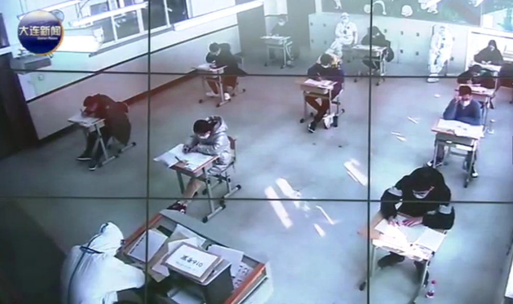 12月26日辽宁省新冠肺炎集中救治大连中心——市第六人民医院一间隔离病房内进行着一场特殊的硕士研究生考试这也是全国首个 新冠肺炎感染者参加的考试 考前30分钟前后,监考老师将考卷拆封并从医院隔离病区的清洁区传递到隔离病房内。由病区护士将考卷发放给正在等候的考生。