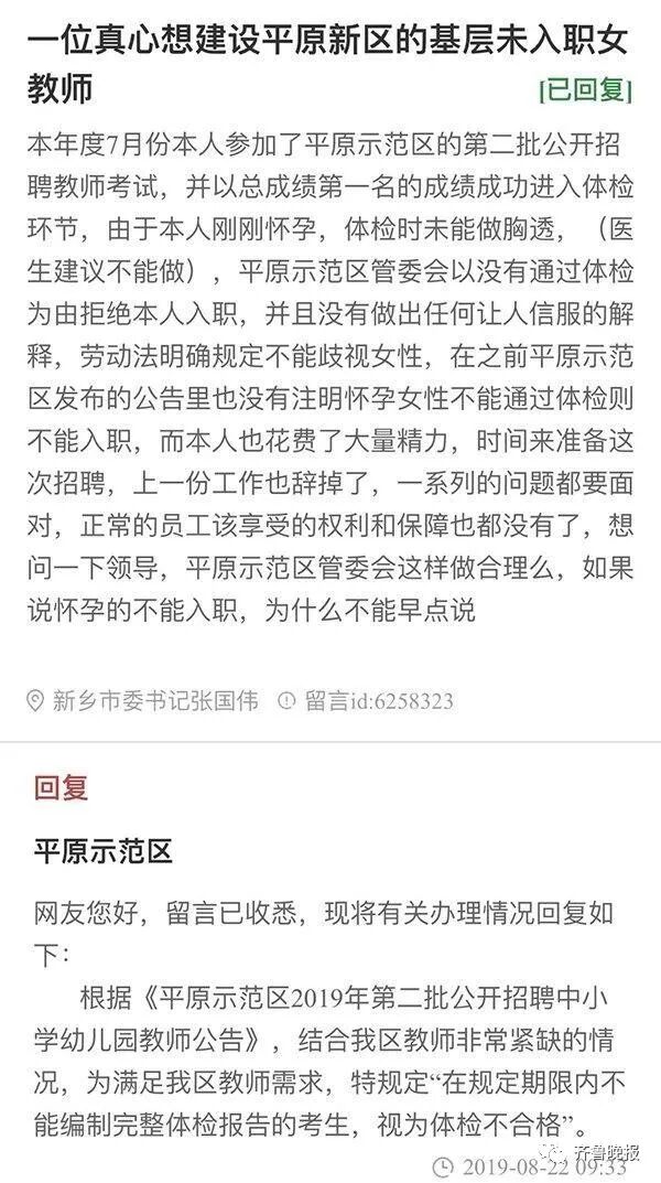 河南原阳县的许女士在2019年6月报名参加了由平原示范区组织人力资源社会保障局和平原示范区文教体卫局联合组织的教师招聘,并以笔试第二,面试第一,总成绩第一的成绩通过了考试。