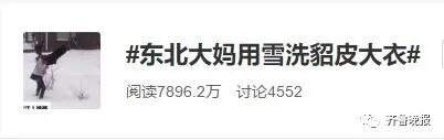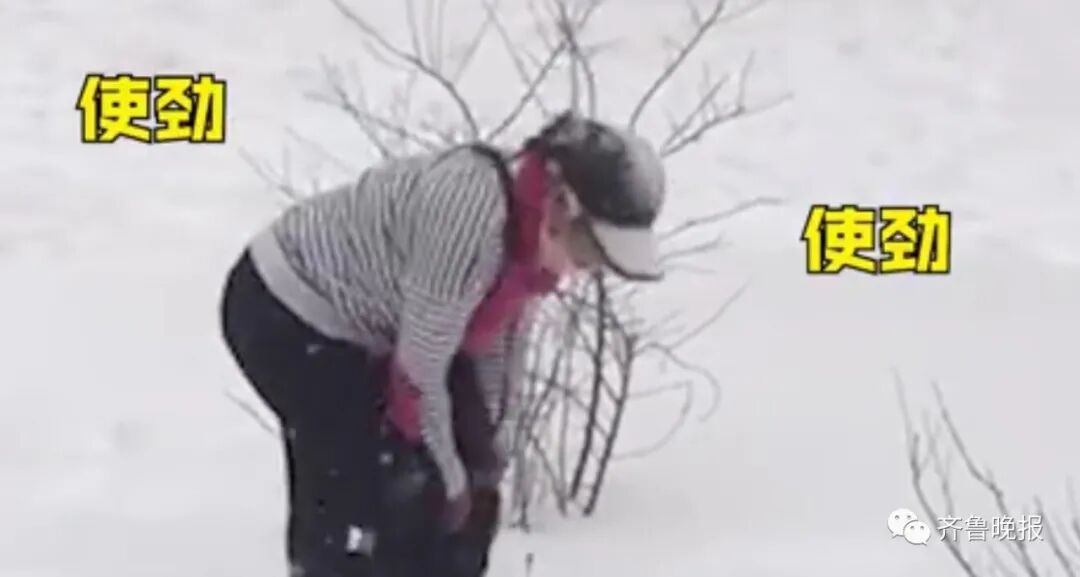 网友拍到一大妈脱掉外套用力在雪地上拍打。