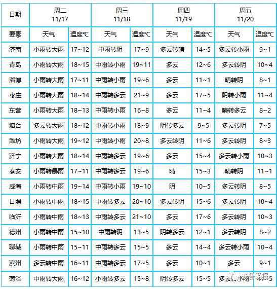 降水过后气温将显著下降,18~20日最低气温降幅8~10℃,20日早晨最低气温:鲁西北和鲁中山区-1~1℃,其他地区3~5℃;21~23日,气温将继续下降。