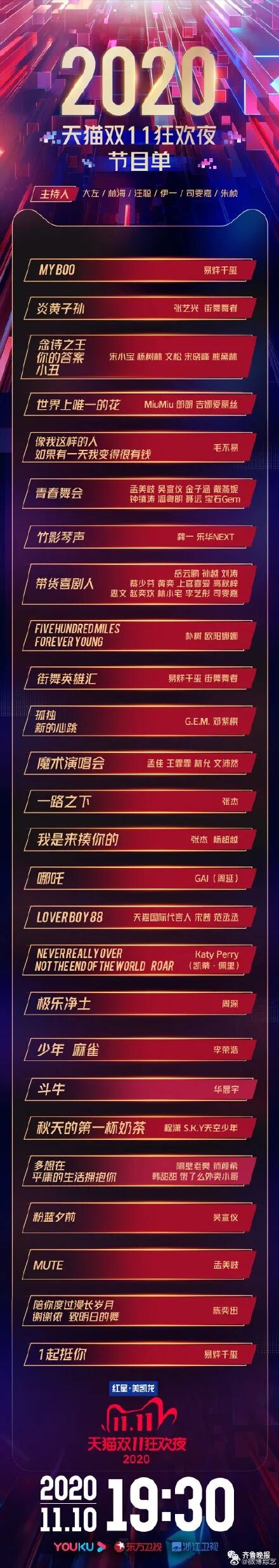 由优酷、东方卫视联手打造的2020天猫双11狂欢夜,11月10日19:30在优酷、淘宝直播、东方卫视、浙江卫视直播。本届“猫晚”将邀请100多位艺人、节目在全球200多个国家和地区播出,派送总价值超过5亿元的福利。